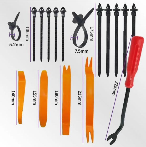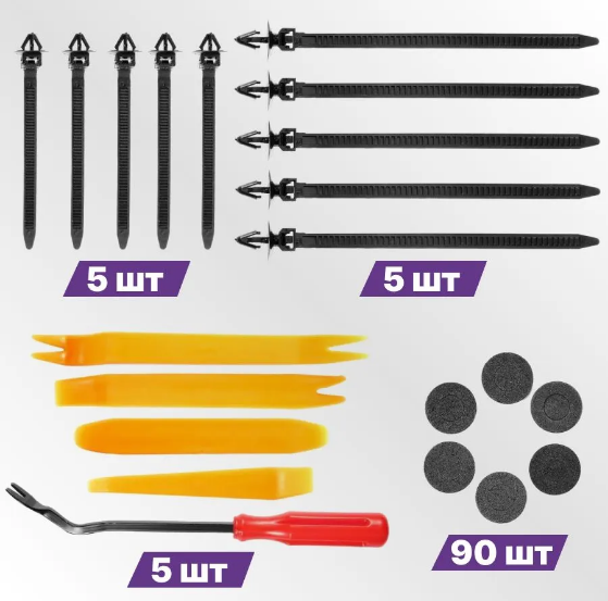 Ремкомплект для авто включает в себя 925 шт разнообразных клипс, ключи для их извлечения, пластиковые хомуты, обеспечивая необходимое оборудование для качественного монтажа и ремонта внутренних и внешних частей транспортного средства. Набор клипс включает в себя 26 видов: клипсы, съемники клипсодеры и хомуты крепления проводки с пистонами. Эти пистоны автомобильные идеально подходят не только для соединения компонентов авто, но также для организации проводов и кабелей, защиты элементов автомобиля, таких как колесные арки, дверные панели и элементы экстерьера. Клипсы подходят для бампера, подкрылок, крыла, дверных карт, обшивки салона, фиксаторы тяг открытия двери, клипсы для крепления уплотнительных резинок двери и капота, клипсы для фиксации номерного знака в штатное место, для обшивки салона, для крепления пыльников под автомобилем, для крепления салонных панелей автомобиля, демферное уплотнение защита от протирания кузова пластиковыми крепежными элементами. Изготовленные из прочного нейлонового материала.