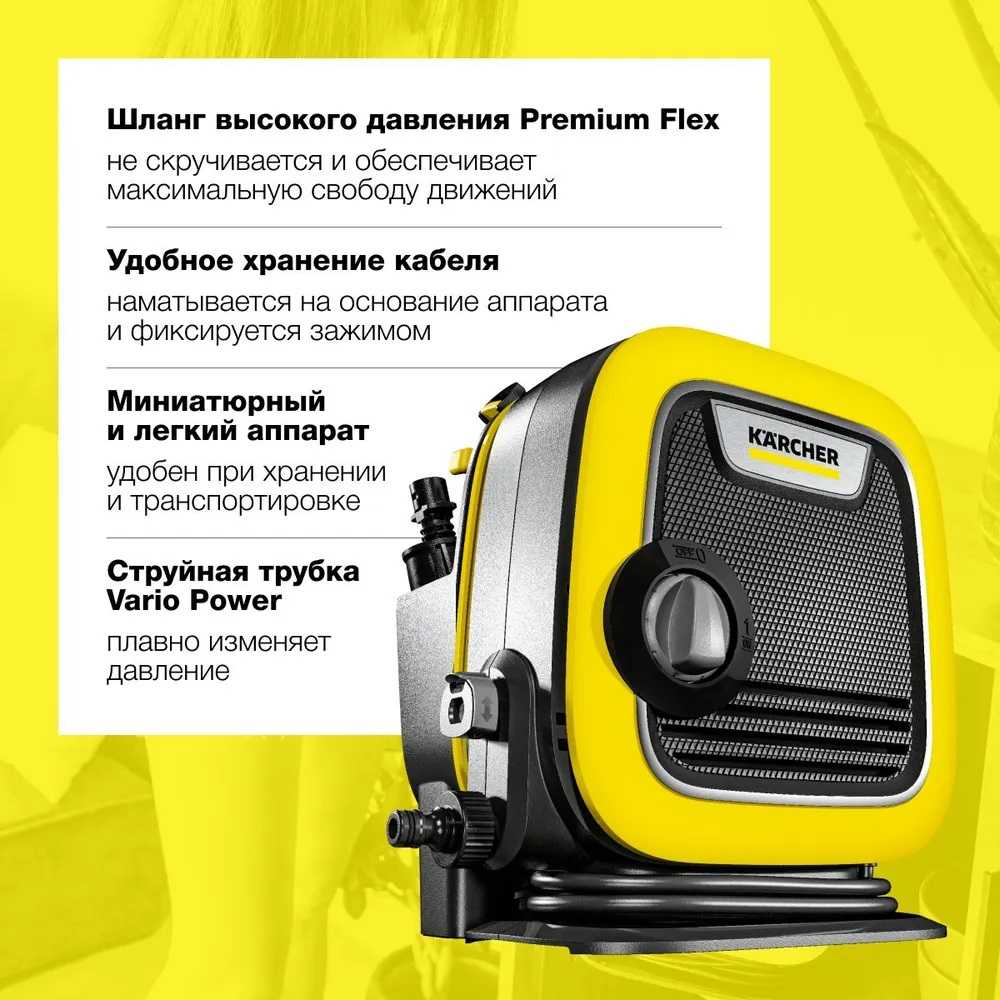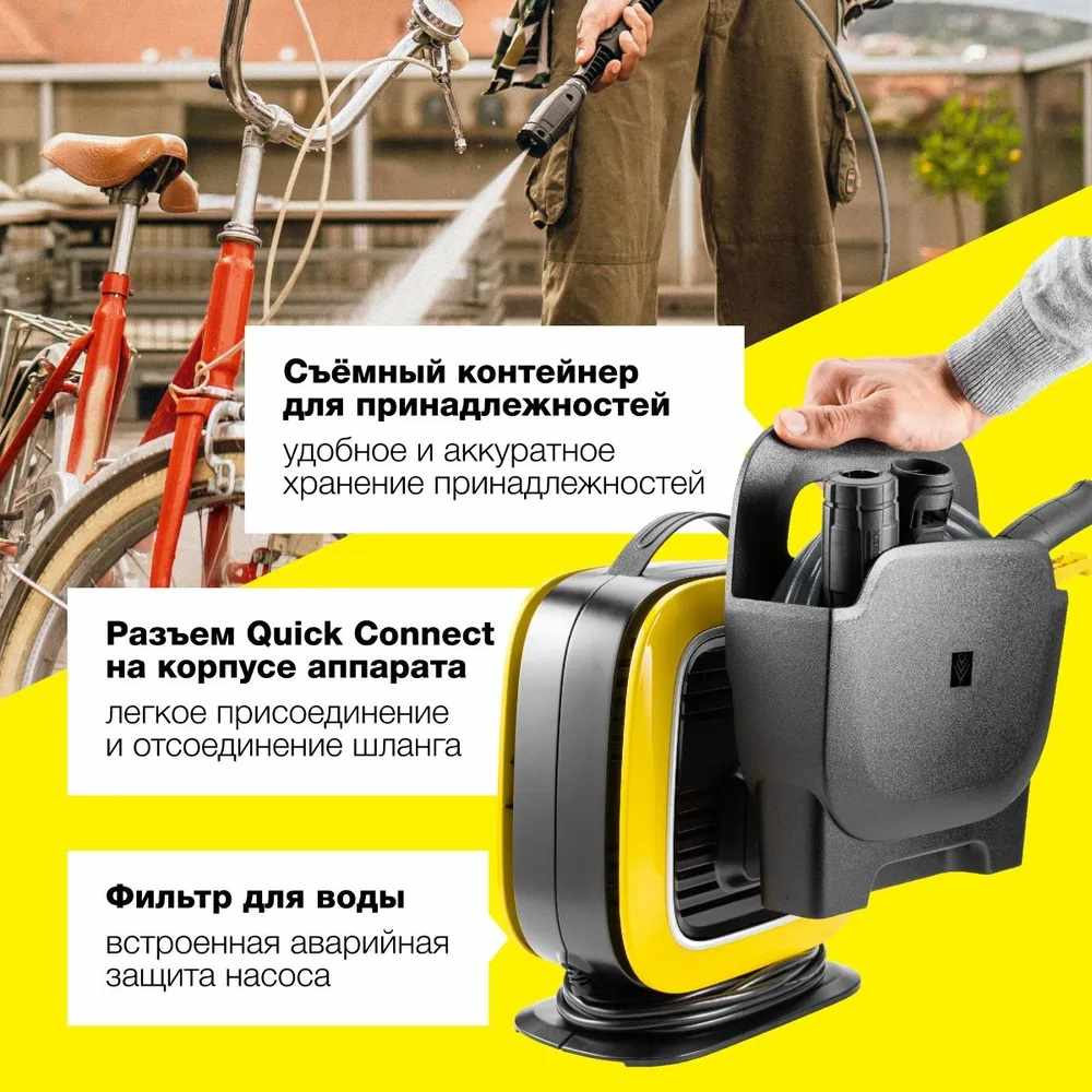 Компактный и легкий: K Mini – самый маленький из аппаратов высокого давления Kärcher. Благодаря компактным размерам и малому весу он очень удобен в транспортировке и хранении, а высокая производительность делает его идеальным решением для быстрой и эффективной очистки балконов, садовой мебели, а также велосипедов и малогабаритных автомобилей.