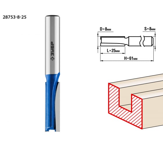 Фреза пазовая прямая, d=8мм,рабочая длина-25мм, ЗУБР