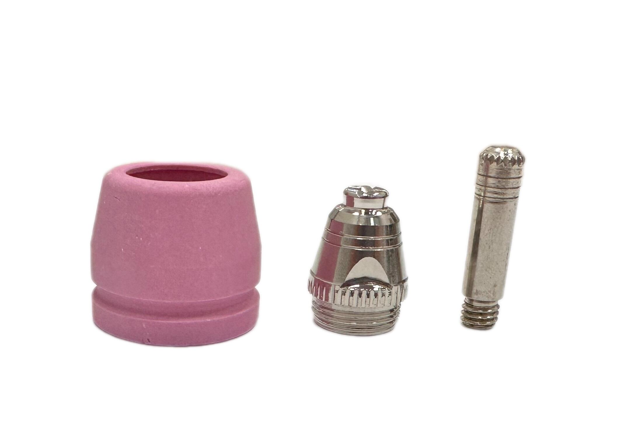 В комплекте идет керамическая чашка, которая защищает все расходники резака от брызг расплавленного металла во время резки, сопло плазменного резака, которое служит для формирования режущей дуги, и электрод, главная функция которого - ионизация газа и формирование плазменной струи под действием электромагнитных сил.